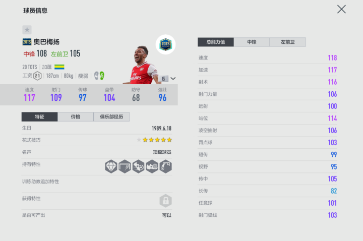 在我们的FIFA ONLINE 4中,奥巴梅扬也依然发挥了他冲刺快的特点。就20TS这张卡来说,6卡的双速高达117+,同时还伴有116的射术,要知道这还没算上队套和银卡套的加成,他简直就是一台无情的冲刺机器啊!在大量的比赛中小编还发现,奥巴梅扬特别擅长反插对手身后,往往只需要一脚直塞他就把对手甩在身后了。