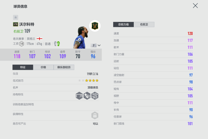 老兵赛季的沃尔科特,可以说是离巅峰最接近的了。从面板上就能看出,7卡的速度正正好好卡在120,甚至超越了前文所提到的四位选手。这张卡,没有那么多花里胡哨的,就是一个字,快!喜欢在边路玩踢墙二过一和过顶传球打身后的玩家一定会对他爱不释手,毕竟在赛场上已经看不到他的速度了,那就在游戏中体验他不讲道理的加速过人吧~