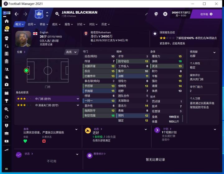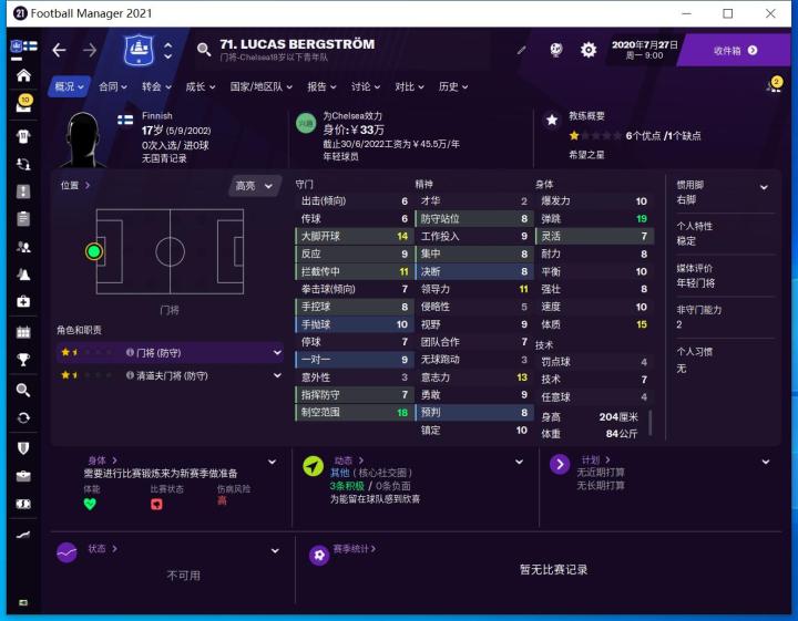 卢卡斯·伯格斯特罗姆是一名门将,他在2018/19赛季被切尔西从家乡芬兰的TPS图尔库签下。身高6尺7寸的他是一位非常高大强壮的门将,他在2018/19赛季的最后一场比赛中首次代表青年队出场,在2:0战胜雷丁的比赛中保持零失球。他还代表芬兰16岁以下国家队出战。2020年夏天升入切尔西U23梯队,本赛季U23出场8次丢13球,尚未完成零封,不过这些比赛切尔西取得了5胜1平2负的战绩,其中的失利是英格兰联赛锦标赛1-2不敌牛津联和U23联赛1-3不敌利物浦U23。作者还将像以往的系列文章一样,借助足球经理来向大家直观介绍这名球员。