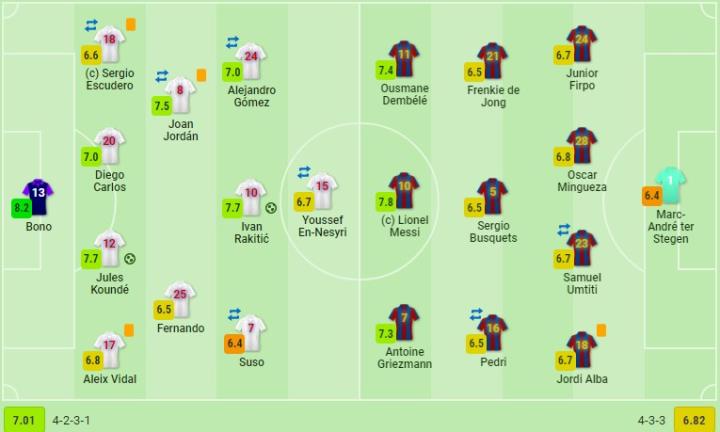 塞维利亚首发:13-布努、12-孔德、20-迭戈-卡洛斯、17-亚历克斯-比达尔、18-埃斯库德罗(69'11-穆尼尔)、10-拉基蒂奇、25-费尔南多、8-霍尔丹(79'6-古德利)、24-亚历杭德罗-戈麦斯(69'4-雷基克)、7-苏索(81'21-奥利弗-托雷斯)、15-恩内斯里(68'9-吕克-德容)