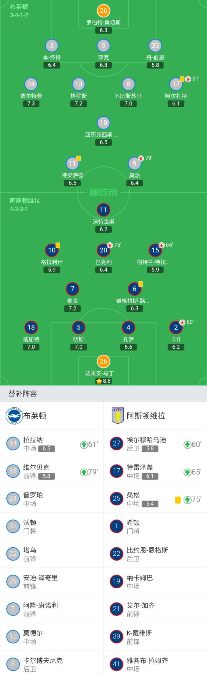 阿斯顿维拉首发:26-达米安-马丁内斯、18-塔加特、5-明斯、4-孔萨、2-卡什(60`27-埃尔穆哈马迪)、6-道格拉斯-路易斯、7-麦金、20-巴克利(75`25-桑松)、10-格拉利什、15-伯特兰-特拉奥雷(65`17-特雷泽盖)、11-沃特金斯