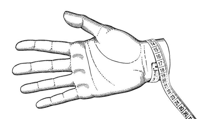 如上图所示测量手腕围,再用身高处以手腕围(cm对cm),得到的数字对比下表: