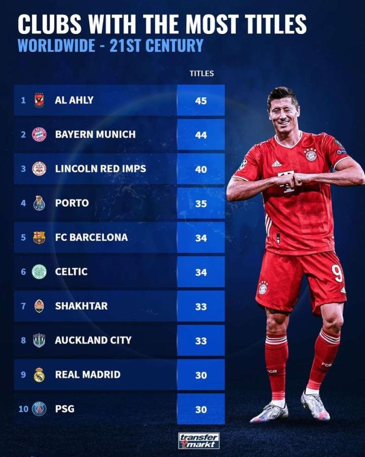 【谁是21世纪拿冠军最多的队伍】 冠军是每个足球队都向往的目标,而在每个国家都有属于他们自己的冠军之师! 那么放眼整个世界,21世纪如今走过了20年,哪个队冠军拿的最多呢! 第1是世俱杯上面让大家领略了风采的 埃及开罗国民队,他们一共拿了45次冠军,在这个排名上他们力压群雄! 第2是拜仁慕尼黑,21世纪他们拿了44个冠军,其中包括15次联赛冠军 第3是直布罗陀的林肯红魔鬼队,他们一共拿了40次冠军 波尔图35次排在第4,包括了11次葡超联赛冠军 第5的是巴塞罗那,他们21世纪拿到了34个冠军,其中10个西甲冠军和4个欧冠冠军 同样34个的还有苏超豪门凯尔特人: 15个苏超冠军 10个苏格兰杯冠军 9个苏格兰联赛杯冠军 拿到33个冠军的一个是乌克兰顿涅茨克矿工,他们在21世纪成为了乌克兰联赛的霸主,一共拿下了13个联赛冠军 还有一个是新西兰的奥克兰城 皇马和巴黎圣日耳曼都是30个冠军,同样榜上有名!
