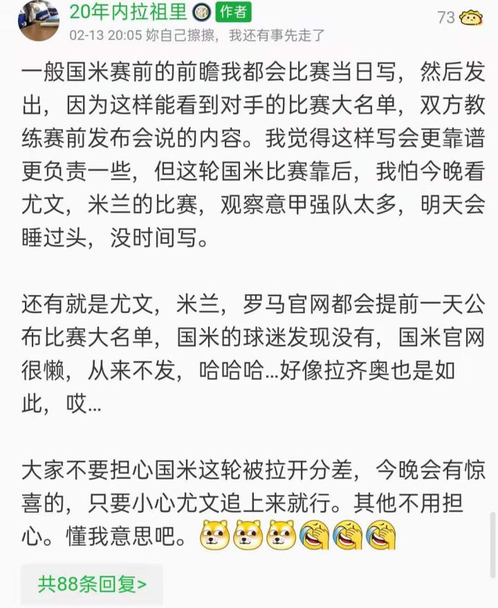 正因为明白这些赛前的不利和上赛季的对战数据,笔者在上周六的赛前前瞻里说出,预测国米本轮大概率打平,非平即负,更看好拉齐奥胜率大的错误观点。(其实笔者近期预测国米比赛挺准的,联赛2:0尤文,4:0贝内文托,2:0佛罗伦萨,意杯2:1米兰,1:2尤文这五场比分都全部在所写国米前瞻里猜中了,已经关注我的朋友,都知道这些的,有发表的记录,绝不是吹牛的,而且本轮开始前的前瞻还准确预测了米兰会被打出冷门的,原因就是看球多,看国米比赛多,看其他意甲强队比赛多的一种预判感觉)但这轮被20多年一直心爱的国米打脸是我最高兴看到的结果。孔蒂战术安排很棒,全队发挥都很棒的。