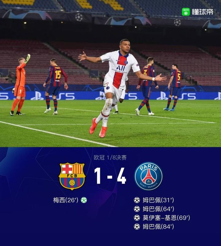 姆巴佩帽子戏法!巴萨1-4遭巴黎逆转,梅西点射,小基恩建功