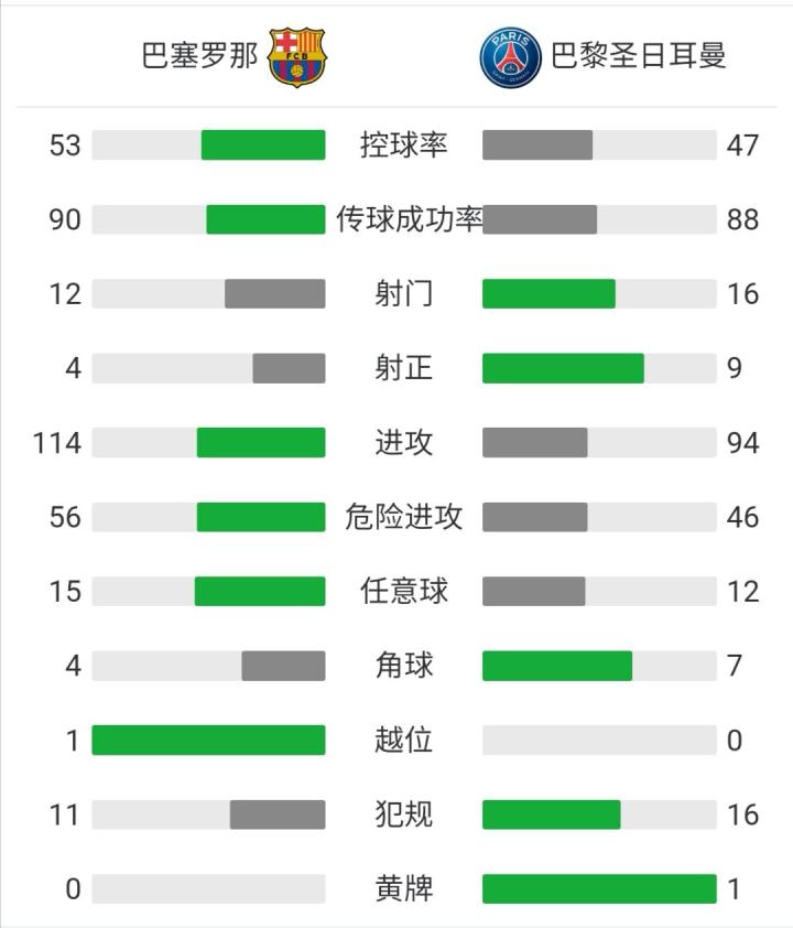 半场战罢,巴萨主场暂时1-1巴黎。