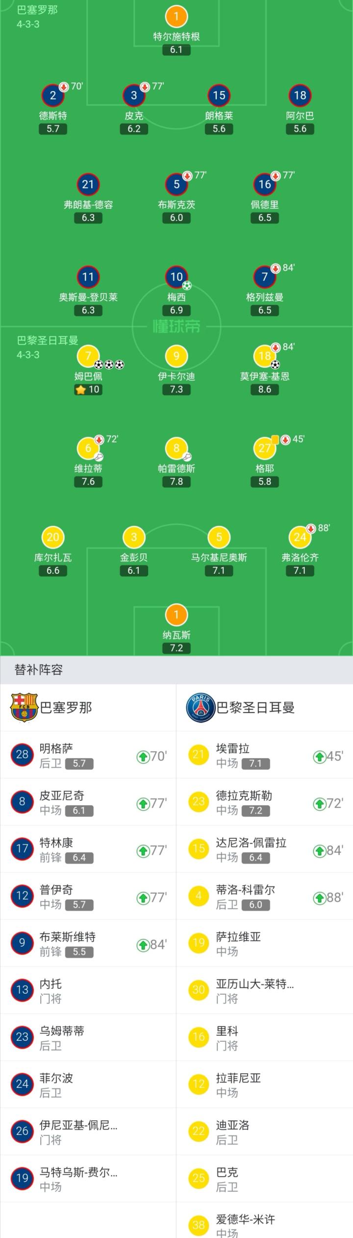 巴塞罗那首发:1-特尔施特根、2-德斯特(70`28-明格萨)、3-皮克(77`12-普伊奇)、15-朗格莱、18-阿尔巴、5-布斯克茨(77`8-皮亚尼奇)、21-弗朗基-德容、16-佩德里(77`17-特林康)、11-奥斯曼-登贝莱、7-格列兹曼(84`9-布莱斯维特)、10-梅西