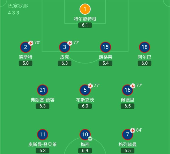 兵败如山倒,科曼终于坐不住了,不考虑伤病问题的话,换下布斯克茨、德斯特、皮克来加强进攻,不像是吹响反击的号角,而是“自杀”的危险信号。