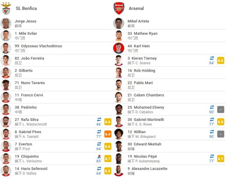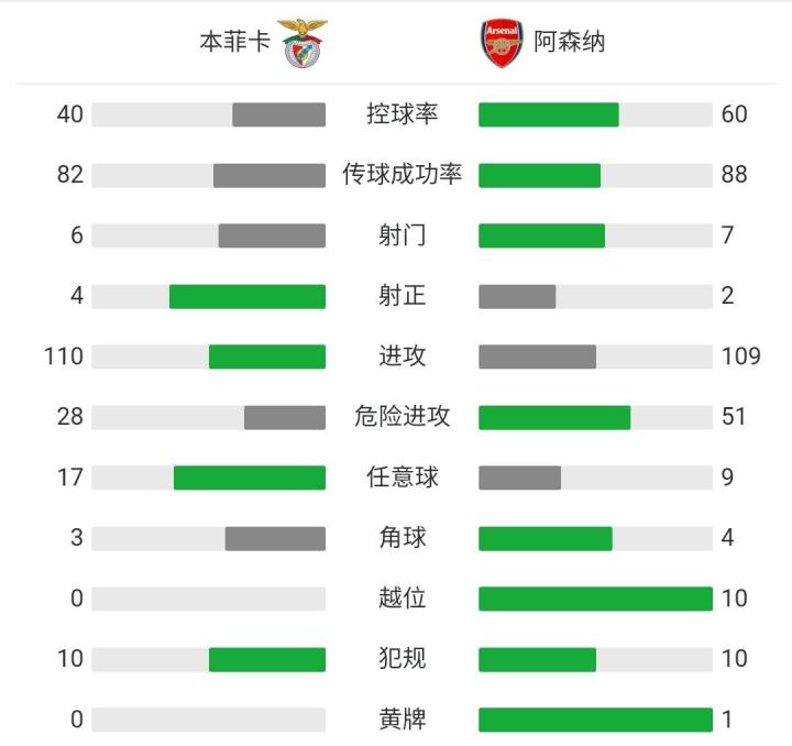 第54分钟,史密斯-罗手球送点,皮齐主罚命中。本菲卡1-0阿森纳。