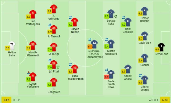 本菲卡首发:77-赫尔顿-莱特、5-维尔通亨、30-奥塔门迪、4-韦里西奥(84'19-奇基尼奥)、28-魏格尔、49-塔拉布特(77'8-加布里埃尔-皮雷斯)、21-皮齐(63'14-塞费罗维奇)、3-格里马尔多、17-迪奥戈-贡萨尔维斯、10-瓦尔德施密特(46'27-拉法-席尔瓦)、9-努涅斯(63'7-埃弗顿)