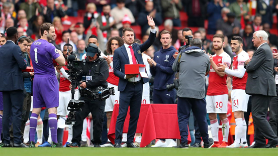 2019年,为阿森纳队效力了11年的拉姆塞(挥手者)离开球队。俱乐部为这名战功赫赫的球员安排了一场别具意义的送别仪式。