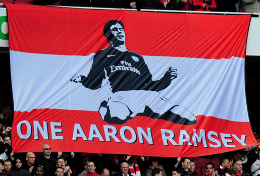 阿森纳队的支持者在看台上悬挂了一幅印有“只有一个拉姆塞”字样的画像。