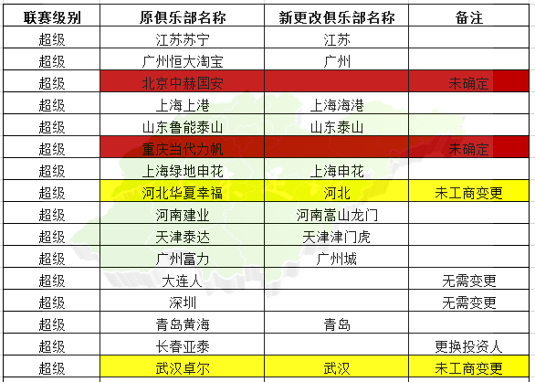 中超联赛,目前北京中赫国安和重庆当代力帆两支队伍未完成变更,据悉北京在无法保留国安的情况下,大概率会选择同大部分中超队伍一样的选择,直接叫做北京队,重庆当代力帆根据报道极有可能更名为重庆两江竞技。河北华夏幸福和武汉卓尔两支已经官宣更名,截至现在未完成工商变更;长春亚泰在更换投资人之后,极有可能不需要变更俱乐部名称;在已经完成的中超队伍中,江苏、广州、青岛与之前深圳一样,仅有行政区域名称,未出现新的名称。