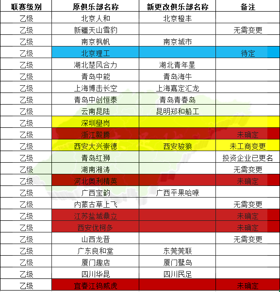 中乙联赛,新疆天山雪豹、湖南湘涛、山西龙晋、内蒙古草上飞四支队伍名称无需变更;深圳壆岗在审核中未通过,但个人认为这个名称应该可以保留;青岛红狮由于投资单位是俱乐部注册的足球投资公司存在红狮字号,未通过后,俱乐部更改了投资公司的名称,青岛红狮可以保留。北京理工同北京北体大一样;西安大兴崇德更名西安骏狼,目前尚未进行工商变更;浙江毅腾、河北奥利精英、西安优柯多、江苏盐城鼎立、宜春江钨威虎等球队尚未确定中性名称。