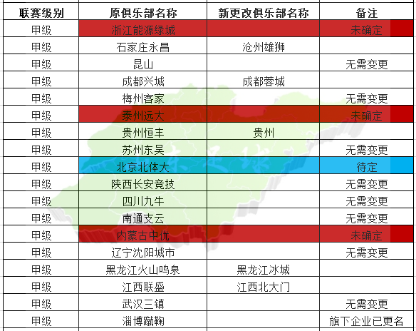 浙江能源绿城由于去年变更名称,目前工商尚不允许再次变更,但是俱乐部依然要着手更改名称,确保中性化;内蒙古中优目前尚未完成更名工作;泰州远大根据目前消息,可能要解散了,俱乐部没有向中国足协申报中性名;淄博蹴鞠由于此前旗下有一个公司重名的原因审核未通过,目前该公司已完成更名,淄博蹴鞠可以继续使用,但是目前俱乐部和球员矛盾已经完全暴露,能否参加新赛季中甲尚不知。
