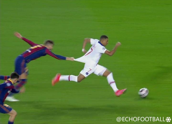 姆巴佩在对方半场,电光火石间连续突破梅西、佩德里、布斯克茨的防守,策动反击