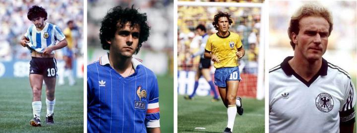 80年代四大巨星。从左至右:马拉多纳、普拉蒂尼、济科、鲁梅尼格