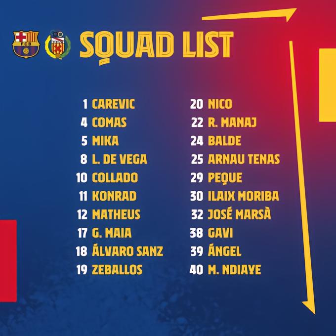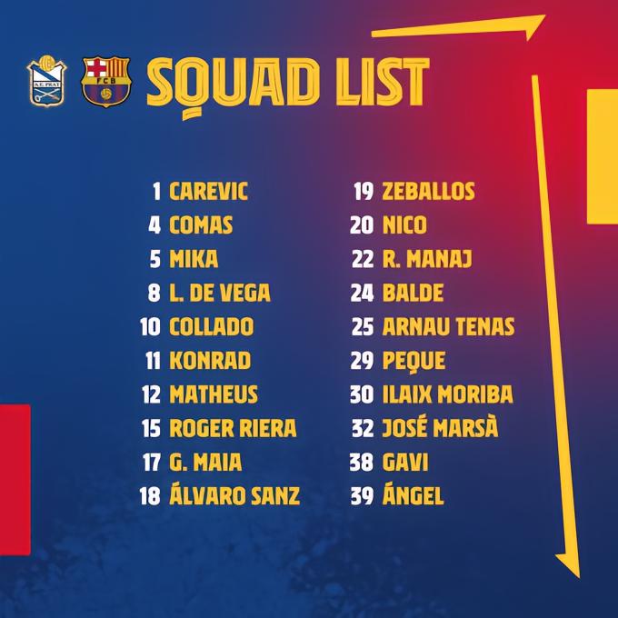 阵容:25-Arnau Tenas/24-Balde(min85, 17-Gustavo Maia), 5-Mika, 4-Comas(min78, 32-Jose Marsa), 18-Alvaro Sanz/20-Nico Gonzalez(min78, 38-Gavi), 30-Ilaix Moriba(min65, 12-Matheus Pereira), 8-Lucas de Vega/10-Collado, 22-Rei Manaj(min77, 19-Zeballos), 11-Konrad de la Fuente