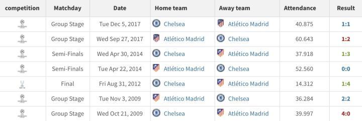 作为欧洲足坛意志足球的代表,马竞与切尔西的每一次碰面都充满了热血的色彩。2009/10赛季,双方在欧冠小组赛相遇,尚未崛起的马竞客场被切尔西4比0痛击,回到主场则战成2比2;2012年欧洲超级杯,法尔考完成帽子戏法,帮助马竞4比1战胜切尔西问鼎;2013/14赛季欧冠半决赛,床单军团总比分3比1淘汰蓝军,与皇马会师决赛;2017/18赛季,两队再次小组碰面,切尔西一胜一平占据上风。