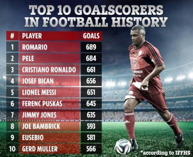不久前IFFHS统计了俱乐部历史射手榜,罗马里奥689球居首,贝利次席,现役C罗与梅西进入前10。而在一个月之前C罗职业生涯进球总数也达到760粒稳居足坛历史第一人称号时,那份榜单上也能找到罗马里奥的名字。