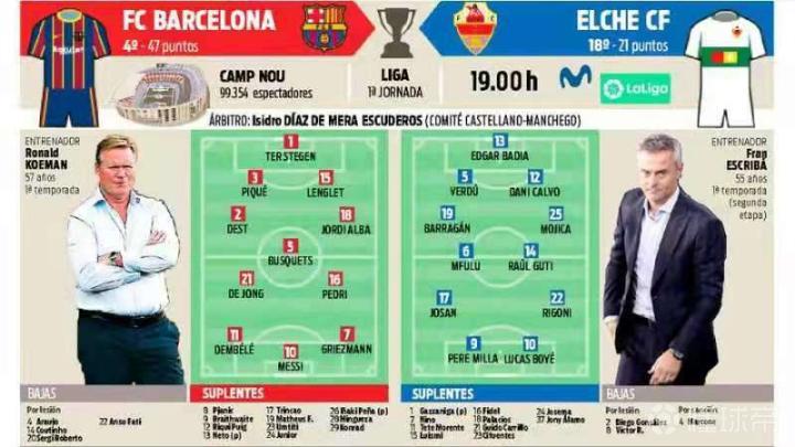巴萨vs埃尔切首发预测 巴萨:1-特尔施特根,3-皮克,15-朗格莱,2-德斯特,18-阿尔巴,5-布斯克茨,21-德容,16-佩德里,7-格列兹曼,11-登贝莱,10-梅西 埃尔切:13-巴迪亚,5-韦尔杜,12-卡尔沃,19-巴拉甘,25-莫西卡,6-姆弗鲁,14-古蒂,17-乔桑,22-里戈尼,9-卢卡斯,10-博耶 而如果要为之后迎战塞维利亚的比赛留力,科曼也许会用明格萨代替德斯特,菲尔波替换阿尔巴,皮亚尼奇换下布斯克茨。