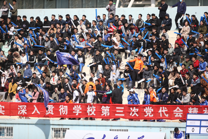 (青大主场,身着蓝色外套的足记团成员活跃在看台)