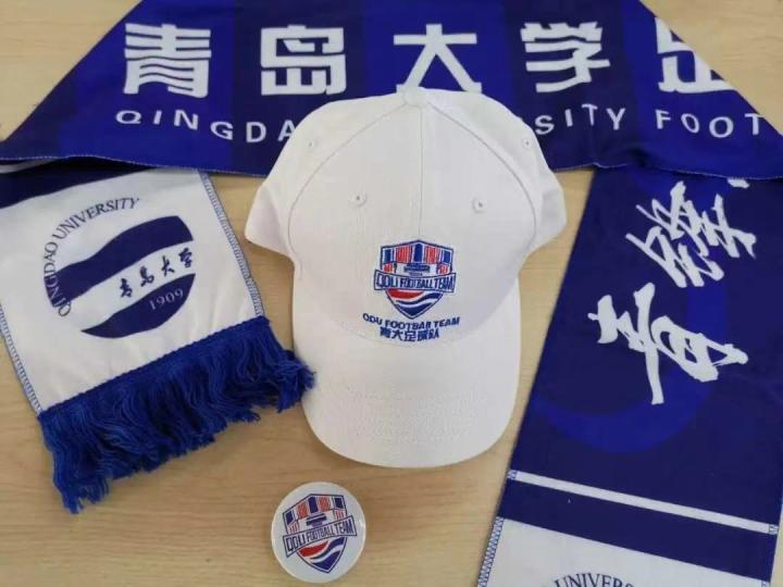 海报制作、球迷文化建设也在青大足记团的业务范围之中。球员生日海报送祝福、比赛赛前海报表态度、节日庆祝海报传温暖。像这么专业的美工团队,一般是职业俱乐部才会有,而在青大足记团,每一个重要节点,海报从不落下,他们用海报宣传球队,用海报为球队加油打气。足记团还负责制作了很多球队周边,他们独立设计了球员Q版漫画,制作了印有球队标志的大旗、鸭舌帽、足球束口袋、徽章等文创产品。