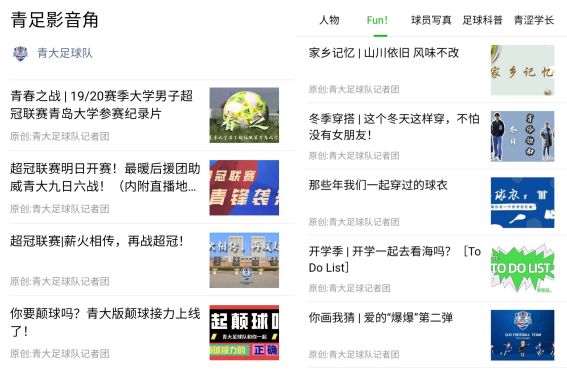 他们推文形式从不局限,日常战报场场见,专栏“人物”让观众全方位多角度认识青大球员,足记侃球栏目聚焦国内外足坛的重要赛事和话题,“球迷专访”讲述第十二人故事,偶尔美食穿搭类软文丰富公众号内容;动态视频记录球队一点一滴,视频短片直击球队出发现场,直播比赛让球迷在云端与球队并肩作战,超冠纪录片回顾球队征程,趣味“快问快答”拉近球队与球迷之间距离。