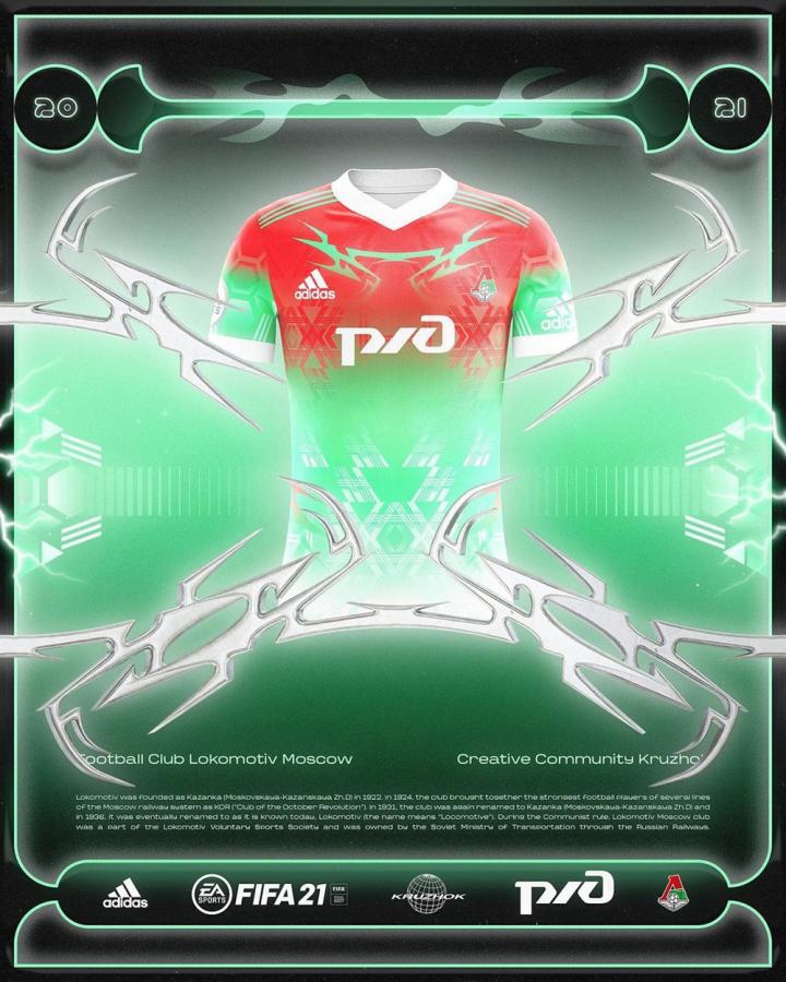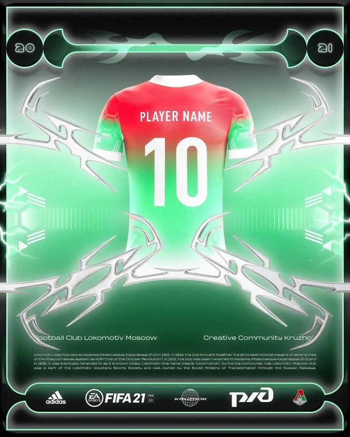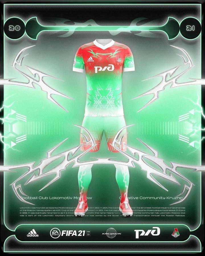 这件虚拟球衣由来自俄罗斯的潮流品牌kruzhok负责设计,将俱乐部经典的红、绿两色以全新方式进行演绎,独特的渐变效果让这件虚拟球衣更具未来感。球衣胸前的独特印花灵感源自于火车车头,从而与俱乐部名称相呼应。这件虚拟球衣还拥有醒目的白色衣领与袖口,同样带有红、绿渐变设计的球裤与球袜使其拥有更出色的视觉效果。