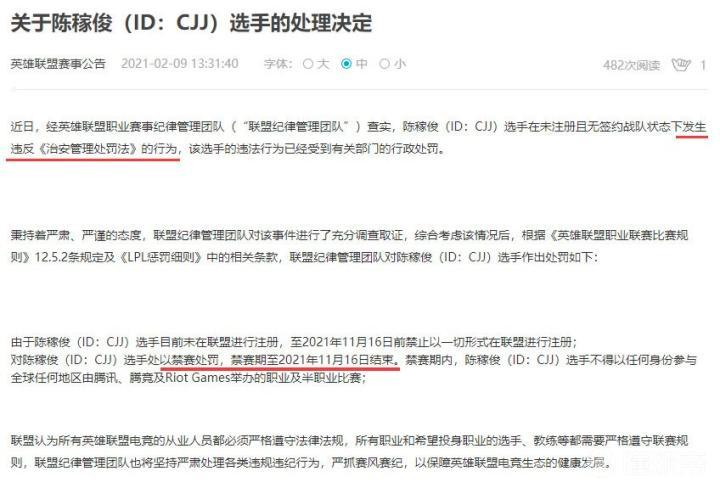 峡谷全视野英雄联盟官方公告:前YM、ES上单CJJ,发生违反《治安管理处罚法》的行为,禁赛至2021年11月16日。