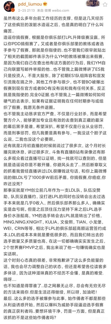 造谣你搞假赛,根据是你俱乐部打LPL升降级赛没赢,所以你PDD搞假赛了。又或者是你俱乐部里的教练或者选手参与了假赛,那就是你指使的..也不管我们很早就贴出了相关的截图邮件表示为什么YM的教练被爆出来假赛,是因为我们自己在查出他有这方面的行为后,我们YM自己向联盟写邮件举报的他...也不管我上篇微博讲了ES我只是投资人,不是大股东,除了初期ES1队组阵容和宣发引流我在搞之外,其他工作参与很少,也不管BO被爆出假赛到现在官方或者BO有没有说和我有任何关系,反正就是我指使的.完全0证据.也不管我上一篇微博如何如何硬气的去表示,如果有证据证明我在任何时期参与或组织了假赛,我愿无条件退圈。