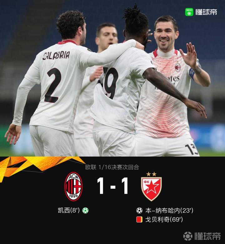 北京时间2月26日4:00,欧联杯1/16决赛次回合的一场较量,意甲豪门AC米兰坐镇圣西罗球场,迎战塞尔维亚球队贝尔格莱德红星。上半场,戈贝利奇送点,凯西点球率先破门,本-纳布哈内进球被吹+中楣,随后伊万尼奇助攻本-纳布哈内扳平,AC米兰暂时1-1贝尔格莱德红星;下半场,戈贝利奇两黄变一红被罚下,萨勒马克尔斯进球被吹。最终AC米兰主场1-1战平贝尔格莱德红星,总比分3-3依靠客场进球优势惊险晋级16强。