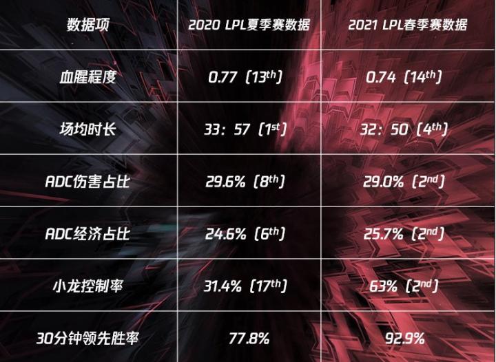 本赛季EDG的打法其实没有太大变化,依然血腥程度较低,场均时长较久,然而ADC的经济占比的提高,意味着EDG对ADC的投入更大,事实证明Viper确实值得EDG对他的投资,战绩自然不用说,小龙控制率直接从联盟倒数第一升至联盟第二,可见EDG如今对下半区的掌控力有了巨大提升。并且有了Viper这定海神针,EDG的上限提升,在比赛后期的底气也就更足,此前的EDG虽然在前期可以较为轻松的取得优势,但是在中后期缺乏终结比赛的能力,现在可以说,EDG有Viper,30分钟后领先胜率的提升就是最好的证明。而今晚他们也将向自己的九连胜发起冲击。