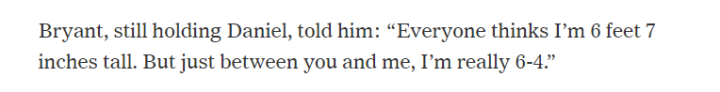 在《纽约时报(https://www.nytimes.com/2006/12/24/sports/basketball/24cheer.html)2006年12月24日的一篇关于科比的文章中写到科比曾经说过: “Everyone thinks I’m 6 feet 7 inches tall. But just between you and me, I’m really 6-4.”