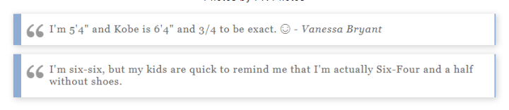 而在一个研究球员身高的网站celebheights中,有两句话也证实了科比的真实裸足身高,瓦妮莎曾说:“我的身高是5英尺4英寸,而科比的身高是6英尺4.75英寸(I'm 5'4" and Kobe is 6'4" and 3/4 to be exact)”,而科比也曾说:“我的身高是6英尺6英寸,但是我的孩子们很快地提醒我,我不穿鞋只有6英尺4.5英寸。”