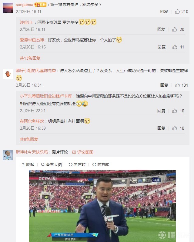 不过显然网友们更愿意回忆起,贺炜此前的名场面,在贺炜晒出的合照中,贺炜位居第一排最右边处。而在此前的一次现场连线时,贺炜的备注曾被错误打成了巴西传奇球星罗纳尔多。有网友仍不忘玩梗称:“第一排最右是谁,罗纳尔多?”