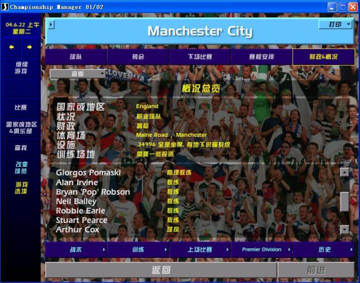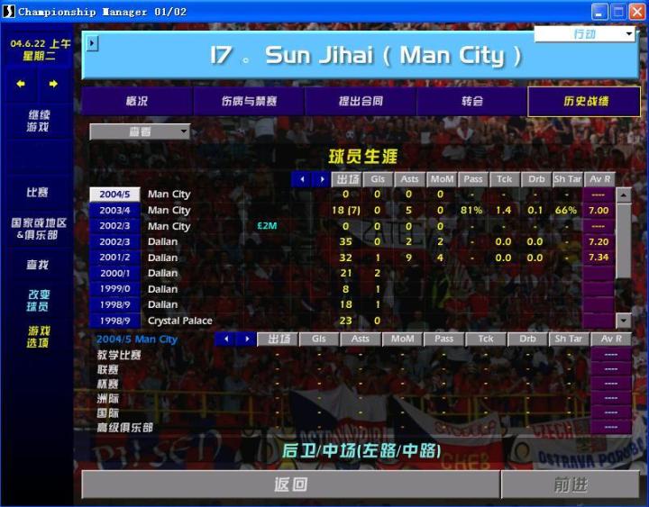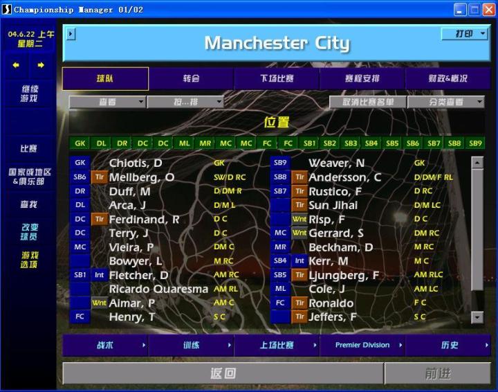 玩的久了,就开始挑战模式,选个弱队开启。用过曼城、桑普多利亚,选桑普多利亚是因为球场坐席多,有利于票房收入;没有劳工证限制,便于转会买卖球员。选曼城是因为孙继海当时在曼城,游戏开档曼城在英甲,孙继海还没过去。