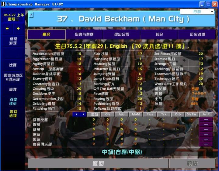 5、小贝,29岁的小贝,数据一级。在游戏里开档曼联,会转会到皇马,再重金砸到曼城。因为开档时联赛除了英超还选了西甲,所以可以用赖皮模式签过来。