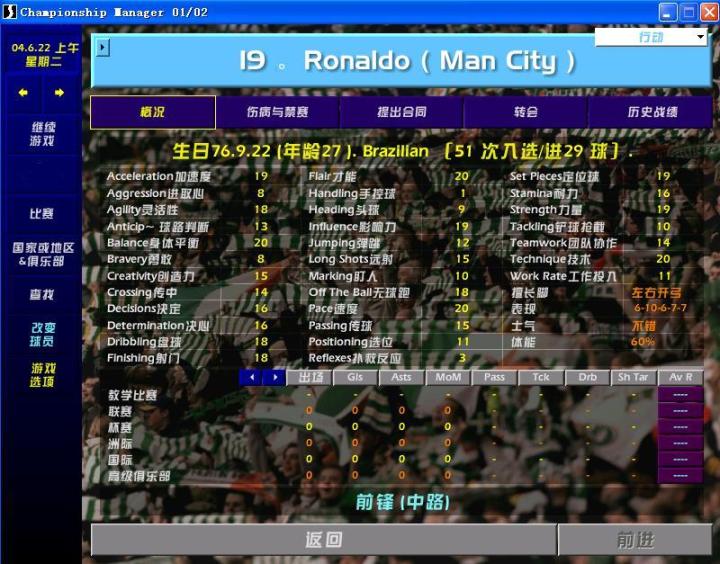 3、大罗,27岁的大罗,数据一级。就是爱受伤,和现实一样,游戏做的很写实。赖皮模式签过来的(新建一个经理,控制另一只球队,曼城购买,新经理同意,交易过来,还能低价,也别太低,董事会会喊暂停。如果球员不同意,就惩罚球员之类骚操作)