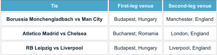 门兴俱乐部、马德里竞技队和莱比锡RB分别改变了他们的冠军联赛对曼城、切尔西和利物浦的第一回合比赛场地。