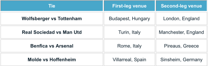 在欧联杯赛中同样如此,阿森纳在意大利迎战葡萄牙豪门本菲卡,次回合在希腊而不是北伦敦,而曼联则在意大利接受皇家社会的挑战。