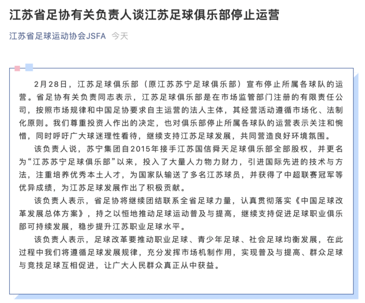 从阶段性外部投入孵化到长期性自主造血发展,是足球事业社会化、职业化、市场化可持续发展的必由之路,也是江苏足球俱乐部一直努力发展的方向。但由于各种无法控制的要素叠加,江苏足球俱乐部无法有效保障继续征战中超、亚冠赛场。近半年来,俱乐部多方奔走寻求承接,以极大的诚意转让俱乐部股权,不放弃江苏足球俱乐部传承的一丝机会。值此2021赛季准入截止之际,纵使我们对为俱乐部争得无上荣誉的球员和与俱乐部休戚与共的球迷有万般的不舍,但我们不得不遗憾公告:即日起,江苏足球俱乐部停止所属各球队的运营,同时在更大范围内期待社会有识之士和企业与我们洽谈后续发展事宜。