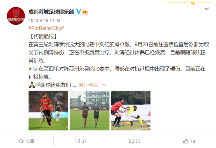 去年,成都蓉城大大方方公开球员伤情报告,不仅有专业的医学术语,也有具体的恢复日期。比起许多俱乐部在运营社交媒体上的遮遮掩掩,成都此举赢得了业内媒体和球迷一片赞誉。