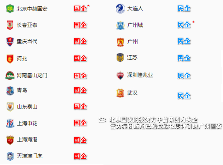 民企无论大小,都难再为足球大规模注入资金,但在过去两三年,国有资本却在大踏步进入足球市场,上文提到的石家庄永昌转身一变成为了沧州建投的合资企业,河南建业与郑州、洛阳市属国企签约,饱受欠薪之苦的重庆当代也找来了两江新区的大国企压阵,保住了球队。如今中超、中甲两级联赛里,国资球队已占据了半壁江山。