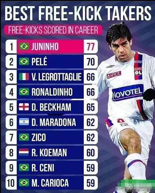 【足坛历史任意球射手榜前10:】C罗和梅西还有机...足球有数据 @懂球帝2021-03-02 22:03【足坛历史任意球射手榜前10:】C罗和梅西还有机会上榜吗? 1.小儒尼尼奥 77球 2.贝利 70球 3.莱罗塔列 66球 4.小罗 66球 5.贝克汉姆 65球 6.马拉多纳 62球 7.济科 62球 8.科曼 60球 9.切尼(门将) 59球 10.卡雷奥卡 59球 …… C罗 56球 梅西 55球展开更多