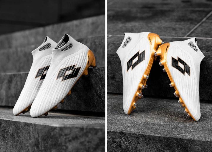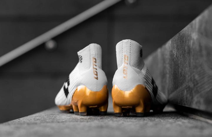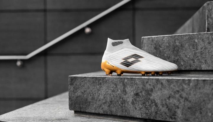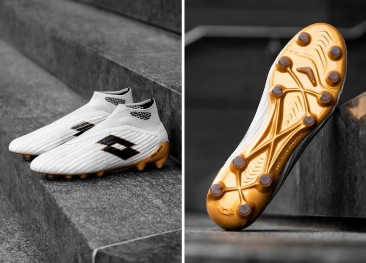 新配色战靴以浅色作为主色,鞋面上缀有黑色Lotto Logo,而大底则拥有亮眼的金色外观。Lotto为这双战靴准备无缝一体式鞋面,进而将球鞋重量降至最低。而针织弹性网布内里包裹双脚,带来紧致贴合的锁定感。中帮鞋领上带有铝膜夹层,与其他高端无鞋带战靴一样带来舒适与稳定的穿着体验。鞋面上的立体摩擦纹理带来更好的控球表现。看过这双战靴,你会感叹Lotto无鞋带战靴的传统被传承下来。