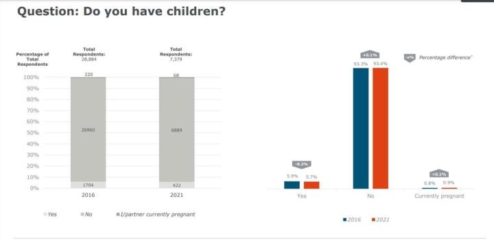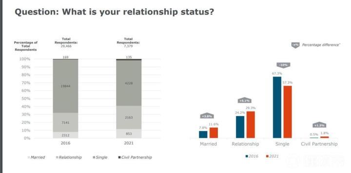 正如大家所猜到的那样,DOTA玩家是以男性居多,并且两次调查性别比没有太大变化。有93.5%的玩家是男性,自然,大部分玩家也是单身状态。虽然相比5年之前有10%的人找到了自己的爱情,但依然有57.3%的人是孑然一身。由于DOTA玩家相对年轻的年龄结构以及单身居多的感情状态,有孩子的玩家属于是凤毛麟角。不过,还是有5.7%的玩家已经为人父母,另外还有0.9%的玩家的孩子即将来到人世。