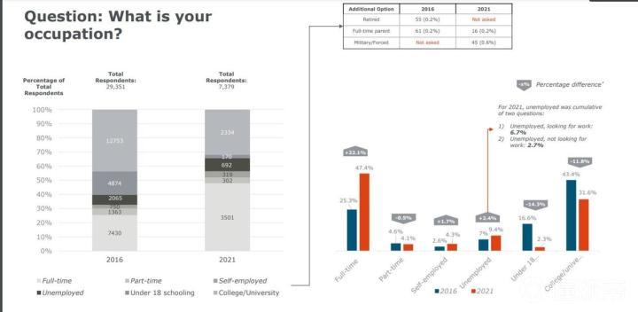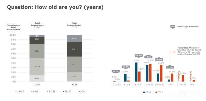 接下来是年龄信息。基本上可以清晰地看到,玩家们的平均年龄相比5年之前也是正好大了五岁左右。14-17岁的玩家比例降低了12.6%,18-21岁的玩家比例也降低了16.8%。相比之下,26-30岁的玩家比例来到了31.2%,而31-35岁的玩家也有11.9%之多。由于年龄的增长,更多的玩家走进了社会,未成年玩家的比例相比5年之前降低了14.3%,只有2.3%。虽然大学生仍然是主力军,占有31.6%,但这个比例也是大幅下滑了11.8%。相对应地,全职工作党则几乎翻了个倍,从16年的25.3%涨到了现在的47.4%。