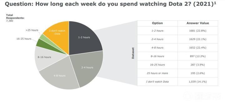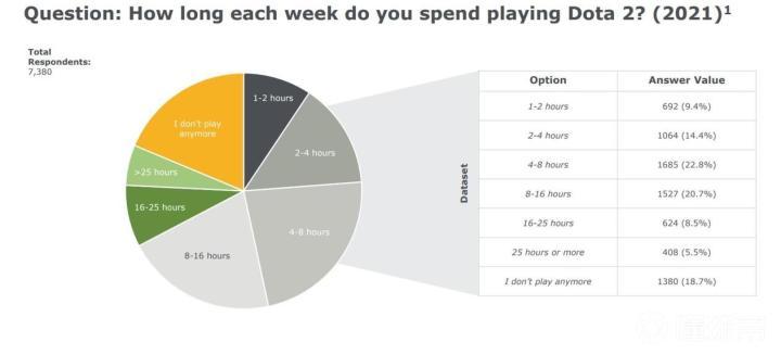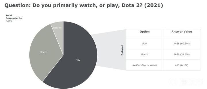 最后一个问题是关于除了DOTA之外的消遣方式。同为V社出品的CS:GO自然是DOTA玩家的最佳之选,有四分之一的DOTA玩家也玩这款游戏。出人意料的是,第二名的竟然是任天堂明星大乱斗,有10.6%的玩家选择了这个选项。9.4%的玩家选择Apex英雄,7.4%的玩家选择火箭联盟,7.3%的玩家选择星际2,而还有7%的玩家我们直接进行一个怒的震。除此之外,PUBG、彩虹六号、炉石、守望、瓦罗兰特和使命召唤等都是很受欢迎的答案。