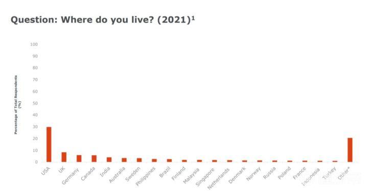 最后是玩家们的国籍。当然,Reddit论坛的用户大多是美国、英国人,不过除了这个两个国家之外依然有很多玩家来自其他国家。实际上,DOTA2的玩家可谓是来自五湖四海,甚至有受访者自称来自于朝鲜和津巴布韦。除此之外,也有约0.2%的受访者来自于中国。